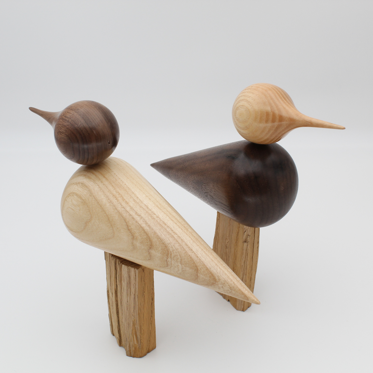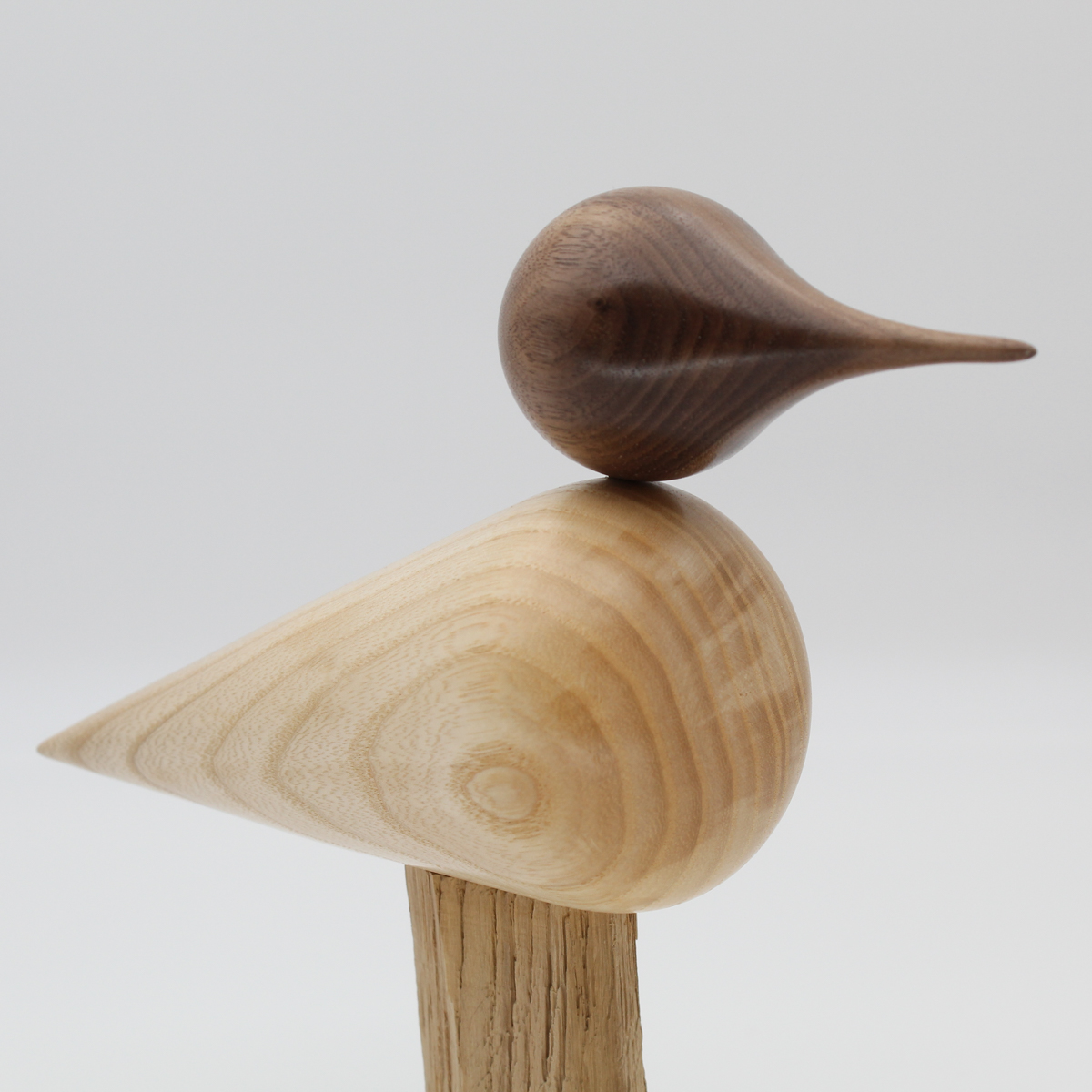 Deux oiseaux en équilibre, l’un en frêne clair à tête de noyer, l’autre en noyer sombre à tête de frêne. Un duo harmonieux et contrasté, où les essences se répondent avec élégance, pour une décoration naturelle et pleine de poésie.