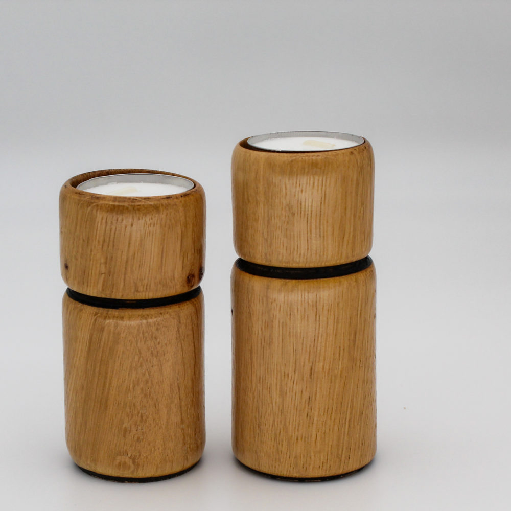 Duo de bougeoirs en bois de chêne design contemporain. Les bougies type “chauffe-plat” sont fournies.