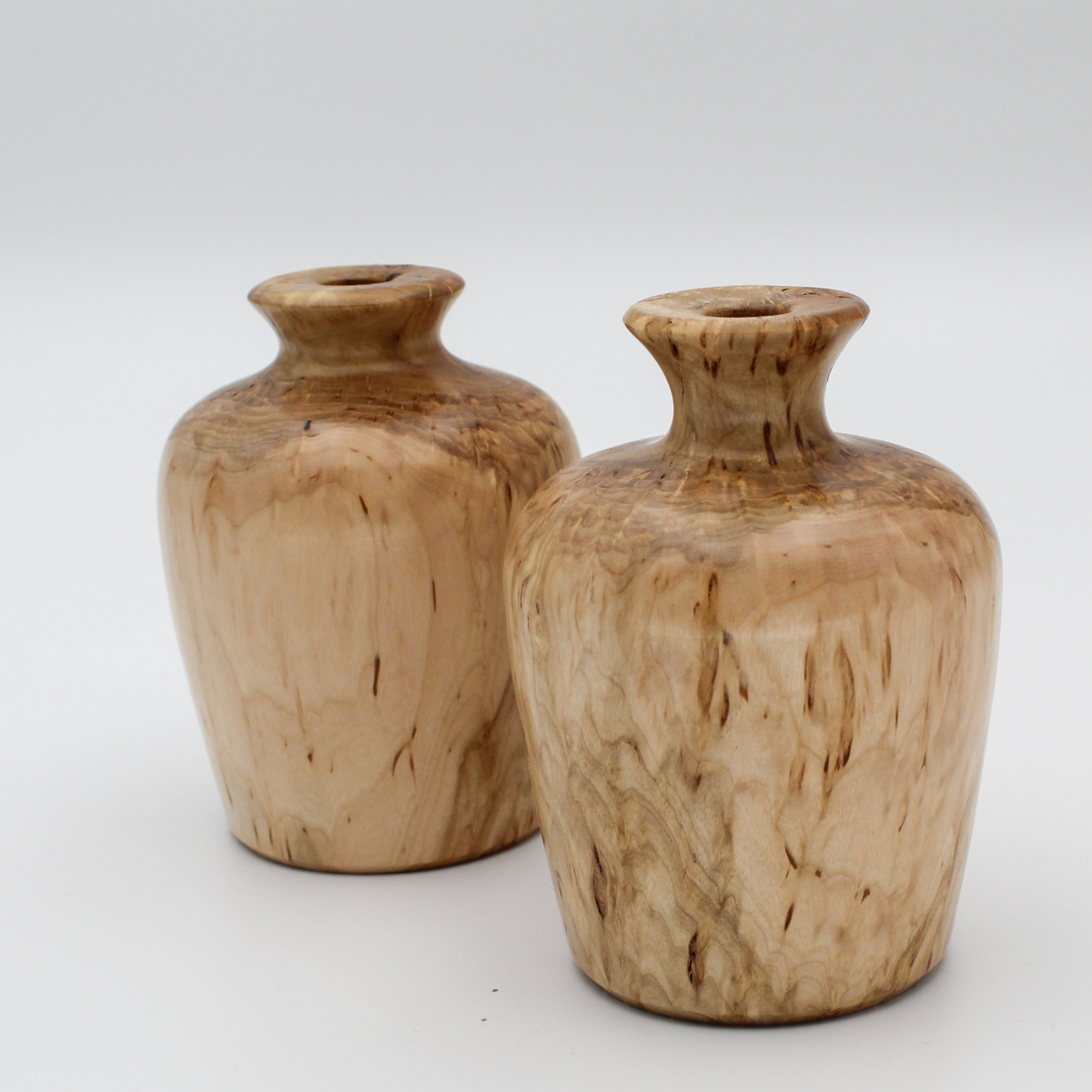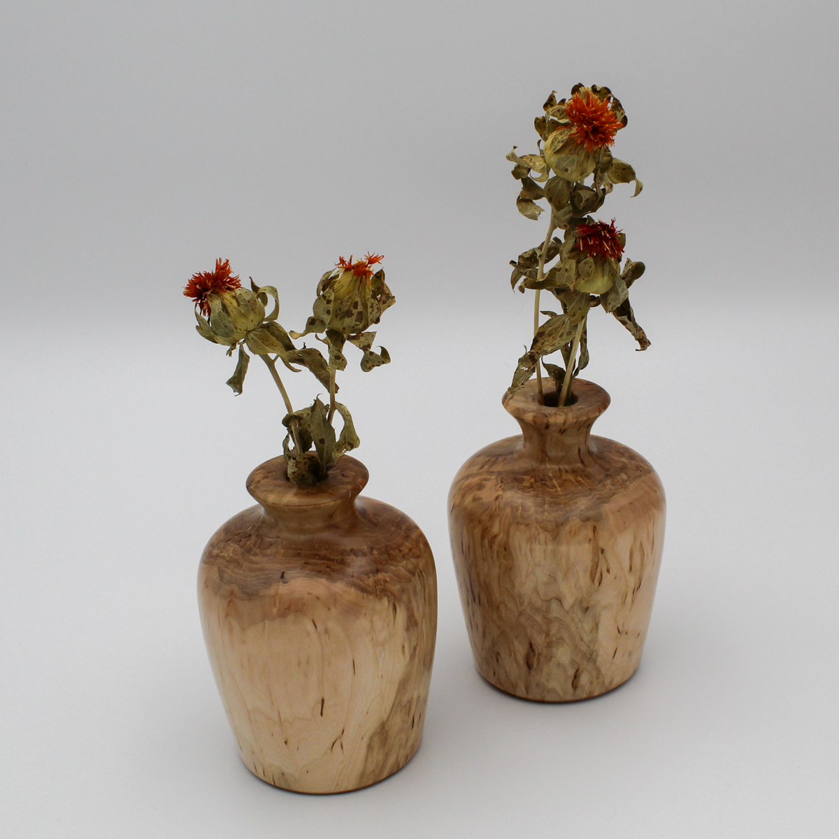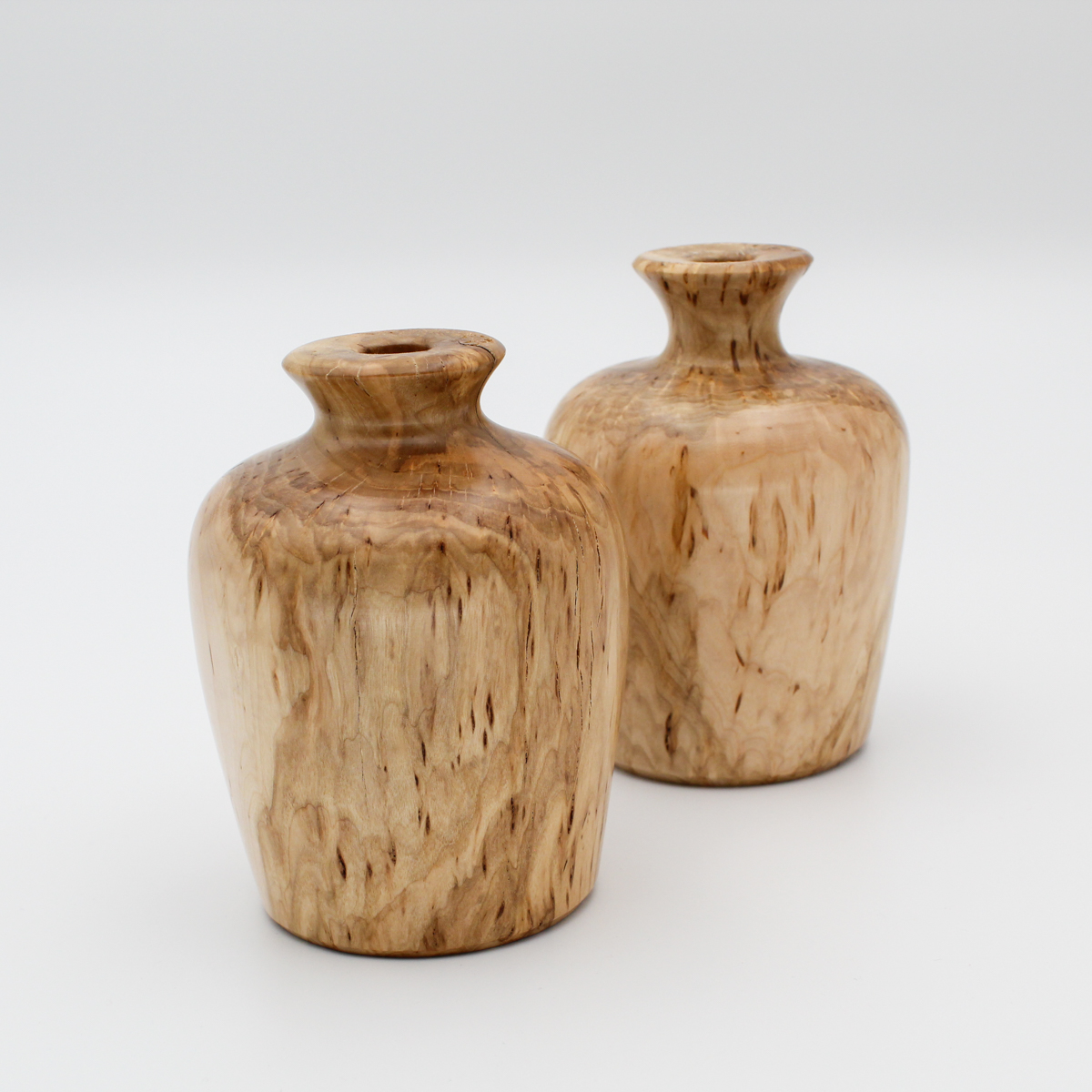 Deux soliflores façonnés dans un bouleau madré aux veinures expressives. Un duo harmonieux, à la fois délicat et plein de personnalité.