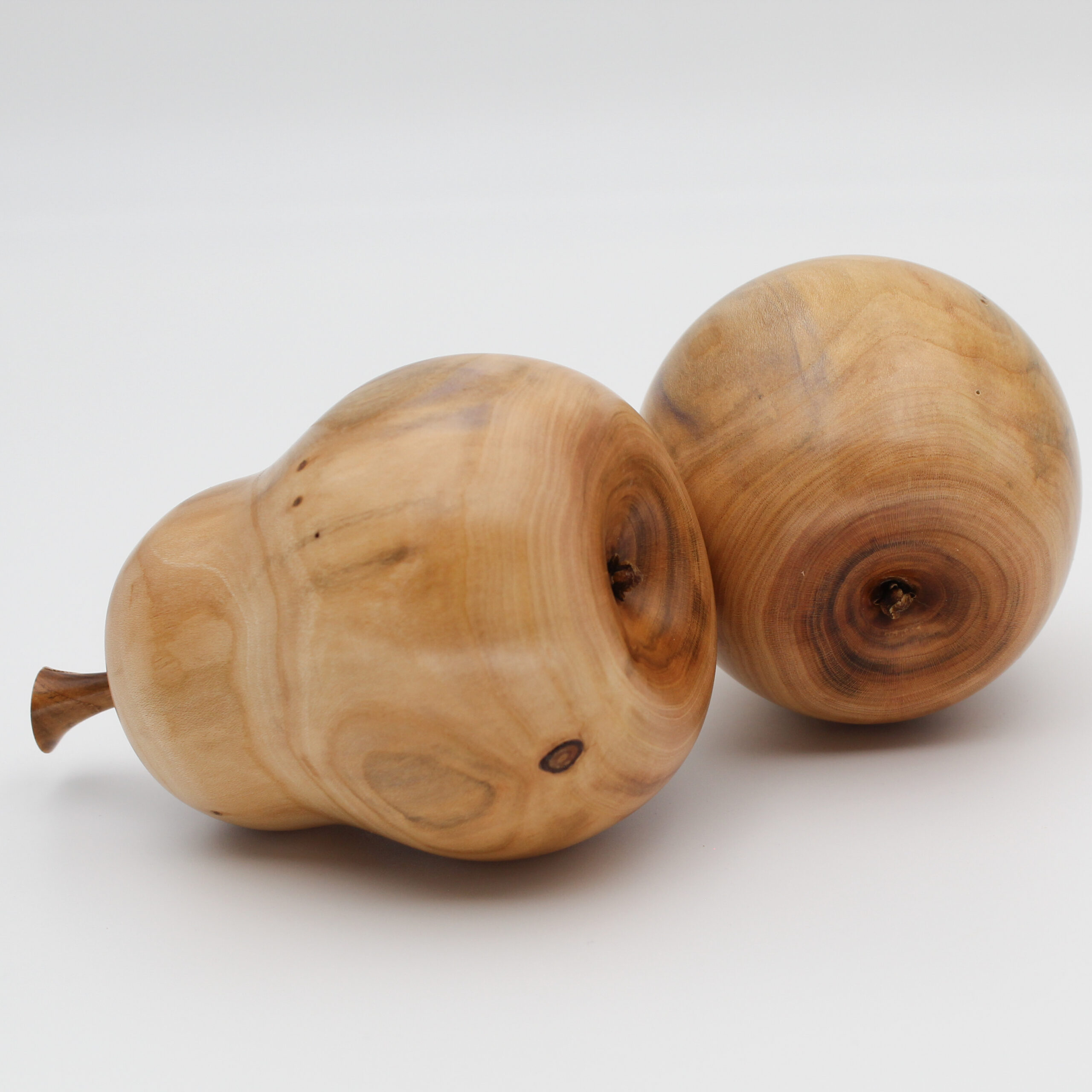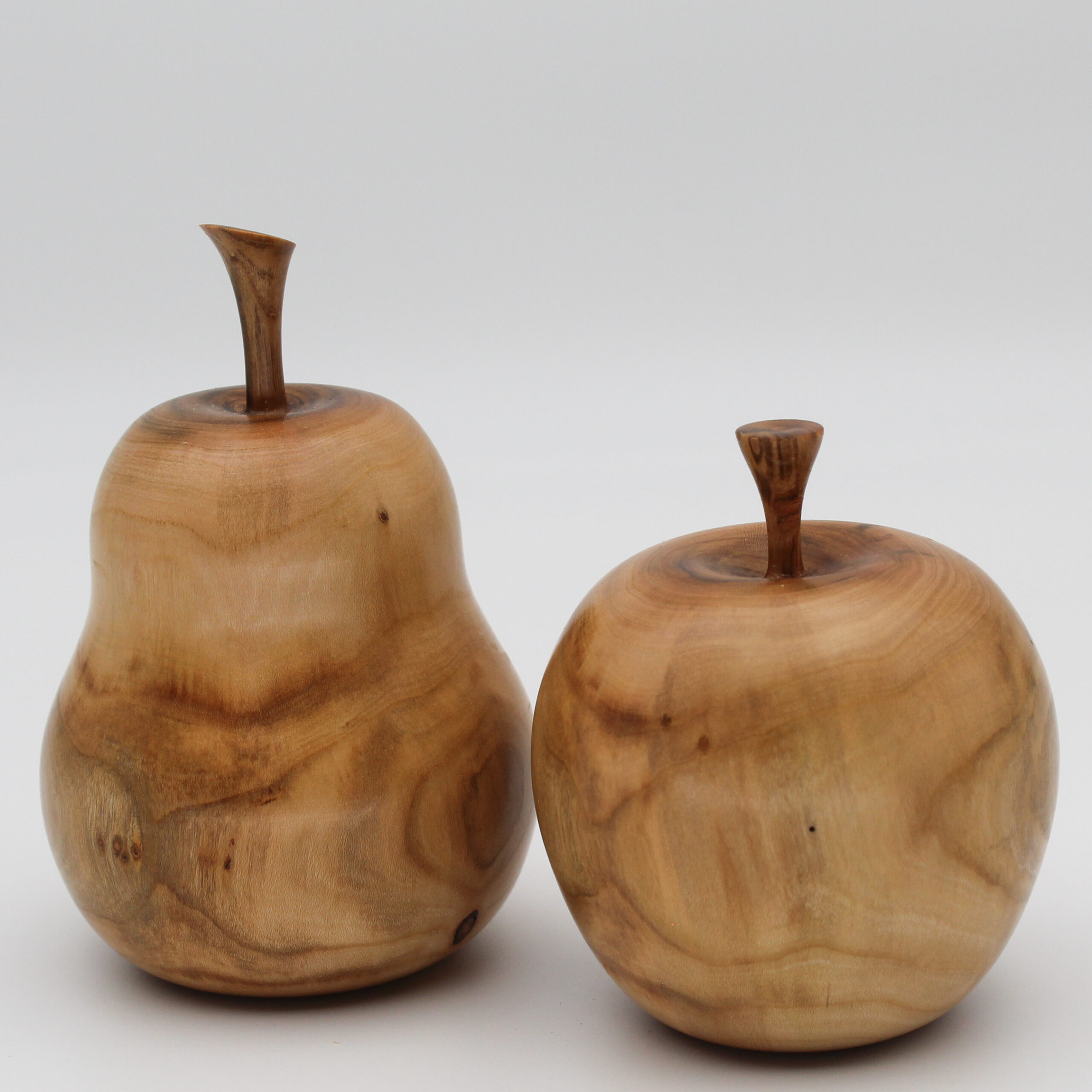 Tournées dans un bois d’abricotier aux teintes chaudes et nuancées, cette pomme et cette poire forment un duo harmonieux. Chaque pièce, façonnée d’un seul bloc avec sa queue intégrée, révèle un travail raffiné et authentique, tout en douceur et naturel