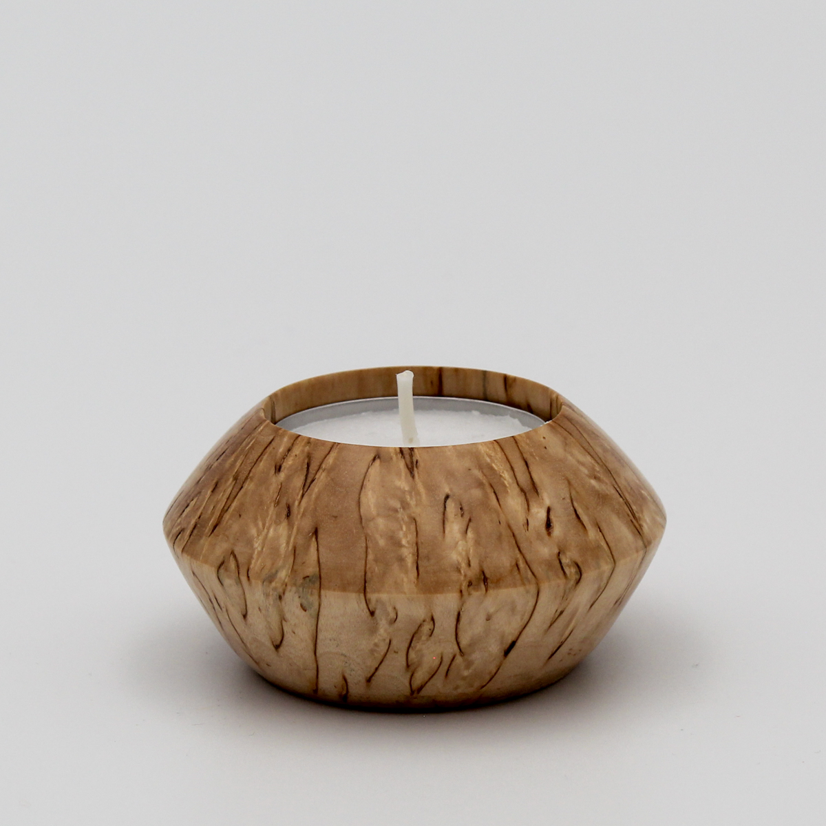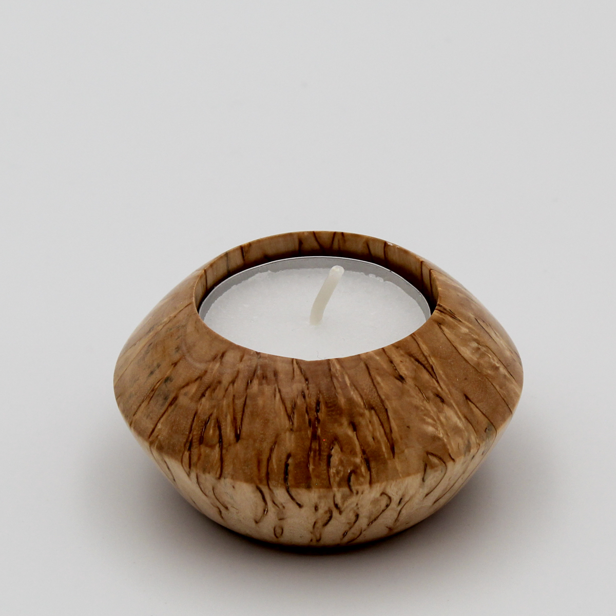 Tourné dans un bouleau madré aux motifs tourmentés, ce petit bougeoir offre un jeu de textures et de lumière unique.