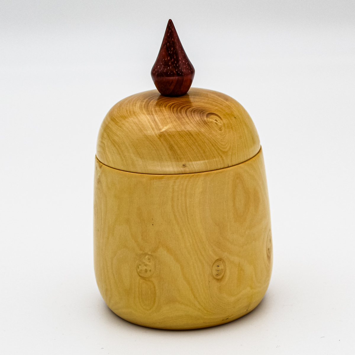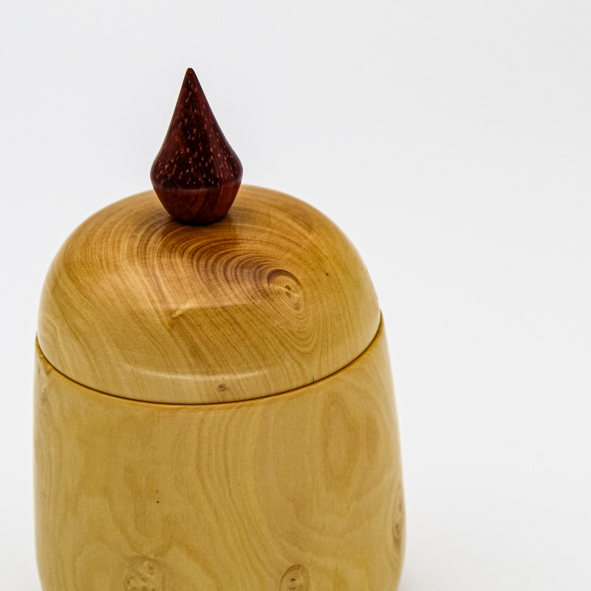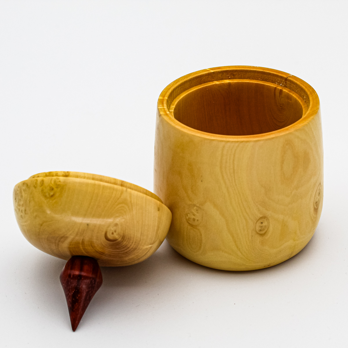Tournée dans un bois de buis au grain fin, cette petite boîte est délicatement surmontée d’un fleuron en padouk avec sa couleur rouge profond. Une pièce raffinée, à la fois décorative et fonctionnelle.